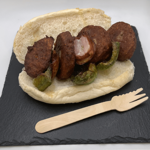 Heerlijk gemarineerd varkensvlees met paprika, ui en spek. Vers gebakken op de bakplaat, geserveerd op een wit broodje